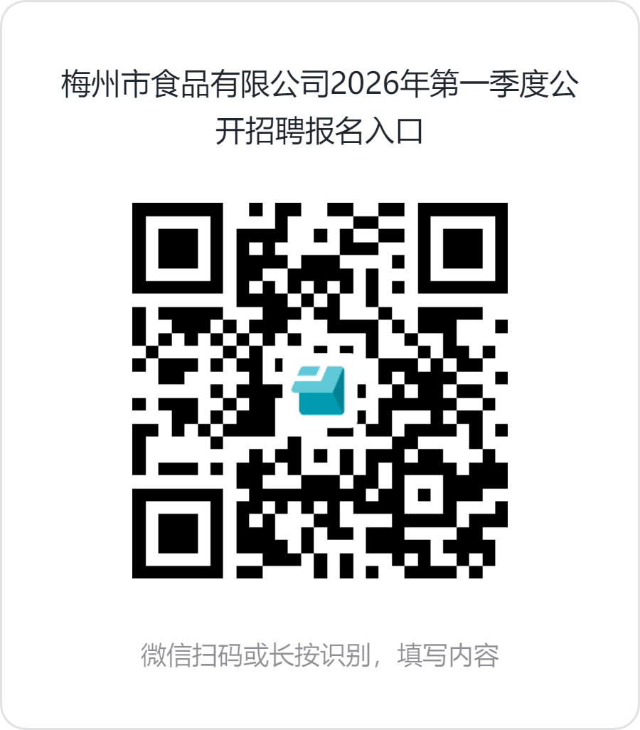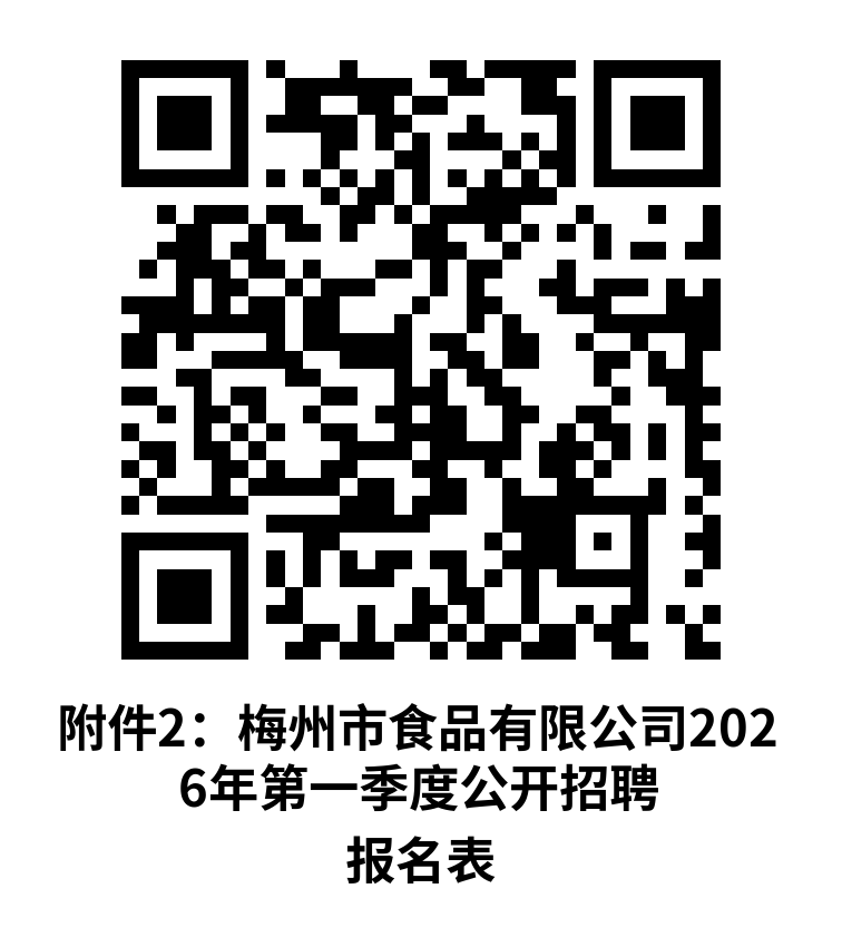 (二)报名方式及注意事项:1、采取网上报名的方式。2、应聘者需扫描公告下方的二维码进入报名入口,根据提示填写信息并上传报名所需的应聘材料。3、每位应聘人员只能选择一个岗位报名。4、报名材料包括:《梅州市食品有限公司2026年第一季度公开招聘报名表》(附件2)签字扫描版、学历学位证书、《教育部学籍在线验证报告》(中国高等教育学生信息网(学信网)查询下载、含有效期内的在线验证码)、近期正面一寸免冠白底电子照片。5、报考人员要仔细阅读招聘公告,并对提交的所有应聘资料的真实性负责,报名材料恕不退还。